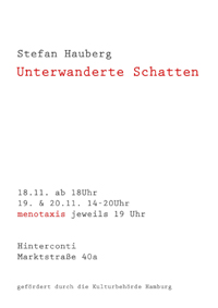 Deadpoint zusammen mit Verena Issel 5.10. - 7.10. Oel-Früh Brandshofer Deich 45 Hamburg Unterwanderte Schatten 18.11. - 20.11. Hinterconti Marktstr. 40a Hamburg - grenzART 1 - das Oberland Performance Art Festival zu Pfingsten 2010 Waldstrasse 23 02681 Kirschau Germany fon:+49.3592.391180 grenzart@obart.eu www.obart.eu Abwege Klanginstallationen / Videoarbeiten 5.9. - 11.10.2009 Vernissage Galerie KUB 5.9. / 19 Uhr galerie KUB Kantstr.18 04275 Leipzig Ostrale 2009 14.8.-6.9., Ostragehege Dresden 16.5. 21 Uhr Performance: Hannah Rath & Stefan Hauberg "Stein, Kohle, Papier" 2. Ostrale Salon Zentrum für zeitgenössische Kunst Messering 8 Dresden |