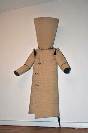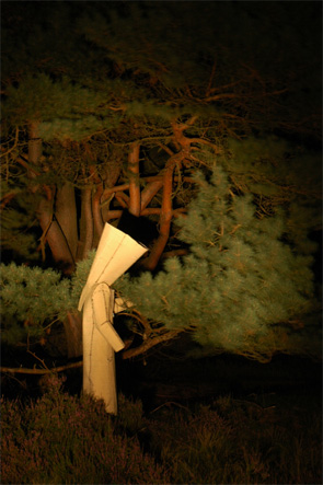 menotaxis 2011, Hinterconti Hamburg In diesem Mantel ist die Sicht auf eine sehr spezielle Art eingeschränkt: Wenn man den Kopf in den Nacken legt,kann man darin nur nach oben sehen! Wenn ich damit nachts nach draußen gehe, z.B. in eine Heidelandschaft, wird die Orientierung zwangsweise auf etwas gelenkt, was deutlich die Himmelsrichtungen zeigen kann: die Sterne und Sternbilder. Besonders der Polarstern eignet sich zur Orientierung, da er seine Position generell nicht durch die Erddrehung verändert. Das feste Material (Sisalteppich) bietet einen Schutz, eine Panzerung gegen Äste, Sträucher, Disteln, Brennesseln usw.. Dadurch bin ich befähigt relativ ungefährdet und resolut auf einer exakten Linie durch die Wildnis zu laufen. Das Material ist sehr starr, dadurch trägt sich dieser "Polarsternmantel" eher wie ein Möbelstück. Der Mantel ist ein Ausgangsobjekt für Videoarbeiten oder nächtliche Performances. ![]() ![]() ![]() |