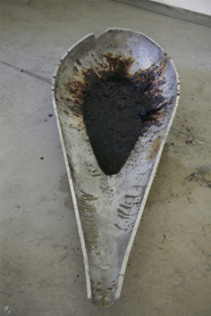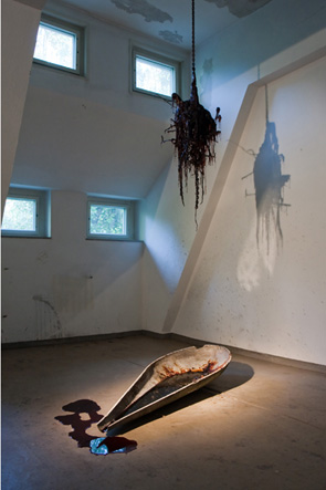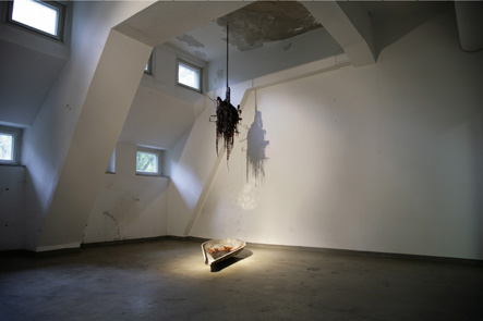 Dawn Ostrale 2011, Dresden Zucker Haut- und Knochenleim Schweineblut Calziumchlorid Schellack verrostete Kette Metallstücke alte Laternenabdeckung "Dawn" ist eine hygroskopische Skulptur. Im Laufe der Zeit verwandelt sich ein Großteil der verwendeten Materialien in zähflüssigen Sirup. ![]() ![]() |