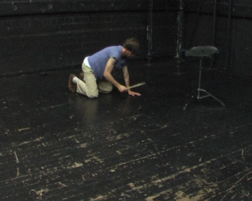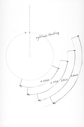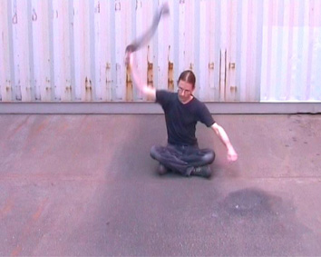 Konstruktion für Schwebung 1&2 Hydramaterial (letztere Videos waren Beiträge für das Theaterstück “Herakles 2 oder die Hydra”, Schauspielhaus und Thalia Hamburg, Regie Franziska Henschel, 2008) Für diese Arbeiten habe ich ein bestimmtes Videoschnitt- verfahren erfunden, bei dem ein Paradox entsteht: Die Gleichzeitigkeit von Zeitraffer und Zeitlupe. Dazu nehme ich eine fortlaufend wiederkehrende zyklische Handlung auf, ich schlage z.B. bei “Konstruktion für Schwebung 2” mit einem Gummistreifen auf den Boden. Von jedem dieser Durchgänge nehme ich ein kleines Stück der Videoaufnahme, beim nächsten Durchgang ein gleichlanges Stück, das innerhalb eines Zyklus minimal zeitlich versetzt dazu ist, usw.. Der Rhythmus dieser Handlung ist auf die “25 Frames pro Sekunde” der Videoaufnahme abgestimmt und erzeugt mit dem anschließenden Schnittrhythmus eine langsame Schwebung. Die körperliche Handlung tritt mit dem Videomaterial in Interferenz. ![]() |